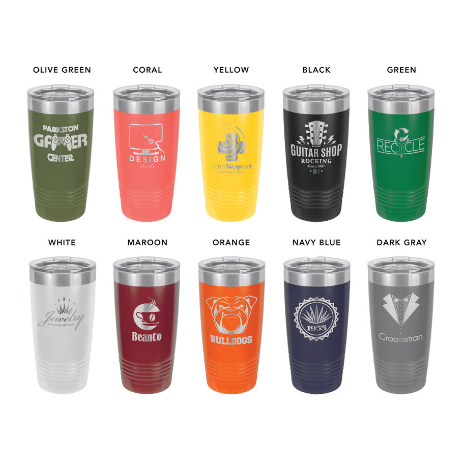 - 20 oz Cups Stainless Steel Travel Tumbler Mug features double-wall vacuum insulation with a clear lid.